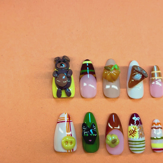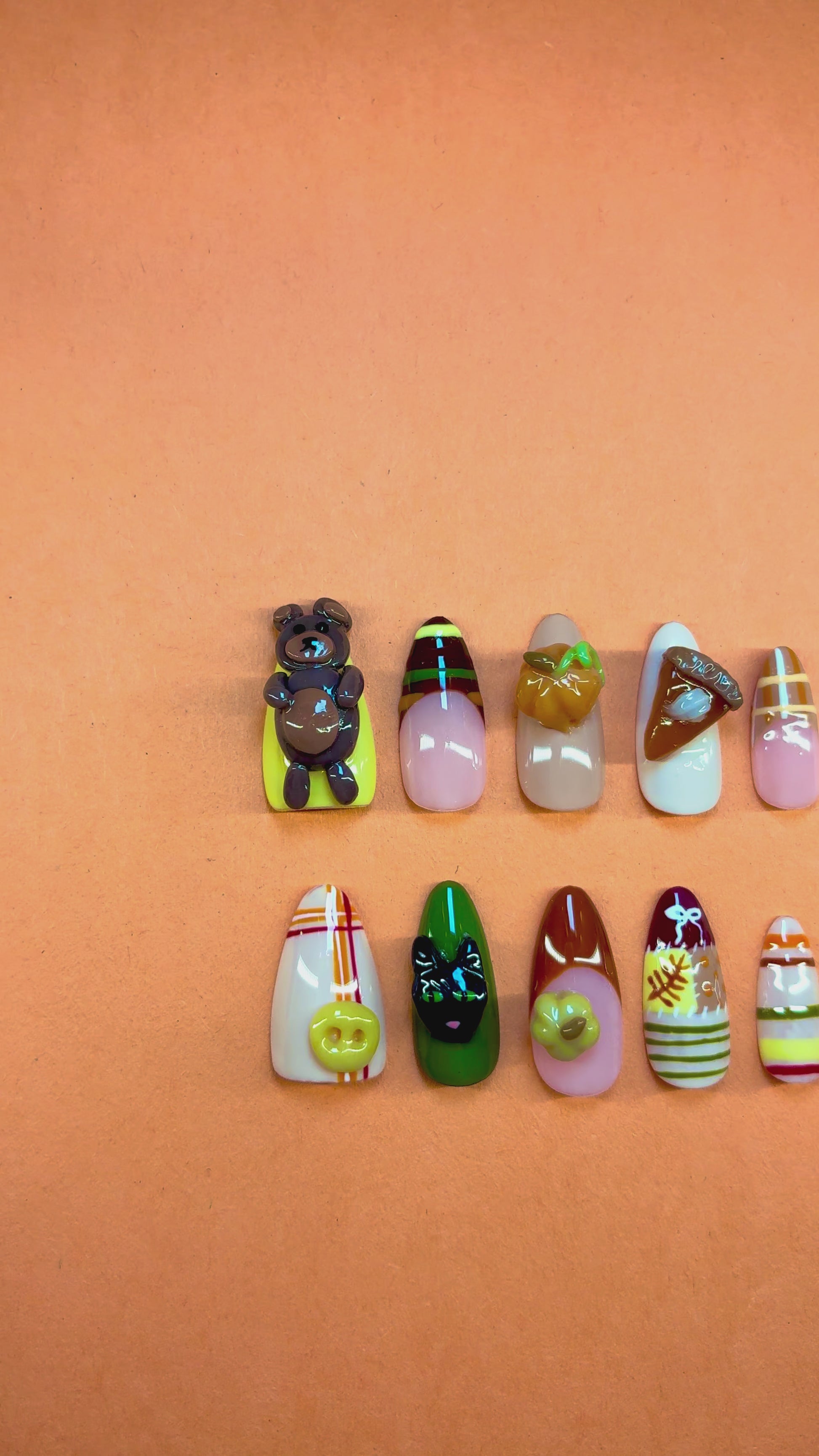 Bring the fall season to your fingertips with this autumn inspired set. Each nail is hand designed with care, showcasing handmade 3D details such as pumpkins, a cuddly bear, a button charm, and a slice of pumpkin pie. The set is brought together with warm autumn tones, candy corn stripes, plaid patterns, and a little black cat for a touch of halloween whimsy. Every piece feels like a tiny work of art, making your nails as festive as the season itself.