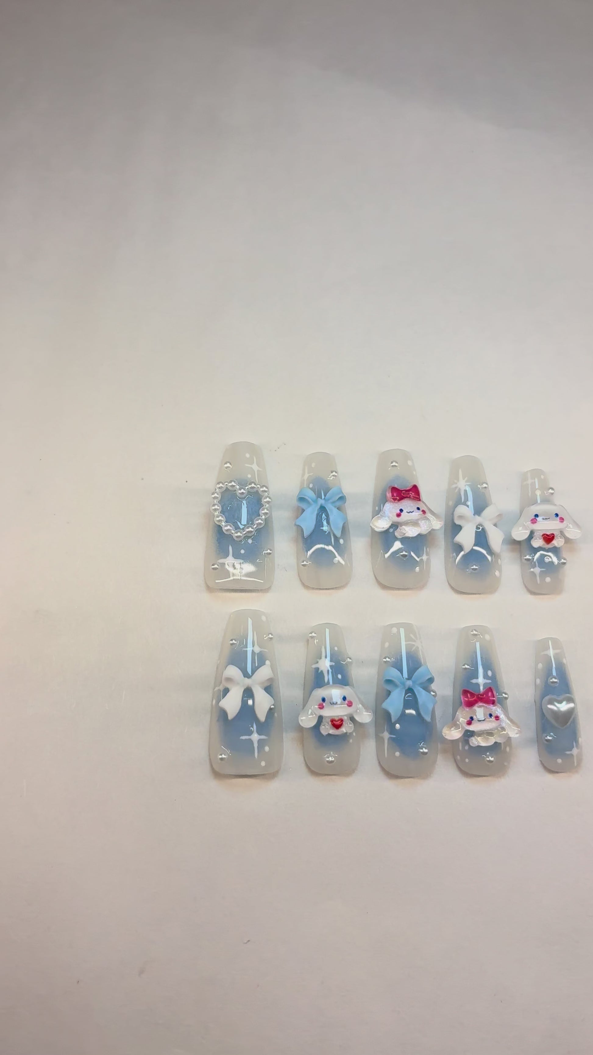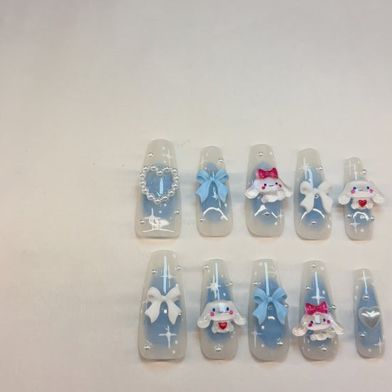 Bring the magic of Sanrio to your fingertips with this dreamy Cinnamoroll-inspired press-on nail set. Soft pastel blue aura are paired with 3D bows, hearts, and the sweet charm of Cinnamoroll for a playful look. Perfect for fans of Sanrio who want to add a touch of fun and character to their nails.